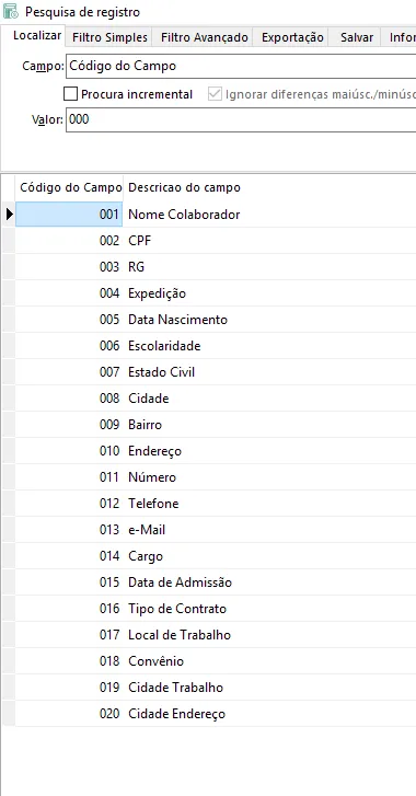 Se trata de uma relação de cadastro dinâmica dos colaboradores, ou seja, por meio dos campos de entrada é possível escolher quais informações deseja listar, eliminando a necessidade de customizar vários relatórios para listar informações parecidas.