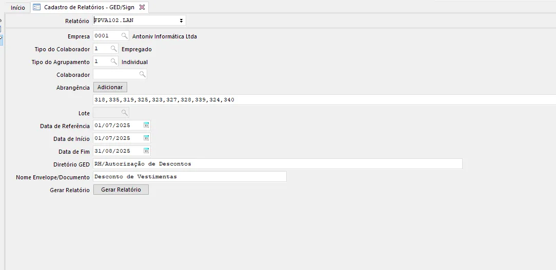 Relatórios de Relação de Cadastro podem ser configurados para envio automático ao GED e encaminhados para assinatura digital. A rotina inclui filtros como Empresa, Tipo, Cadastro, Data Inicial, Data Final e Competência, além de criação de telas e tabelas para uso padronizado.